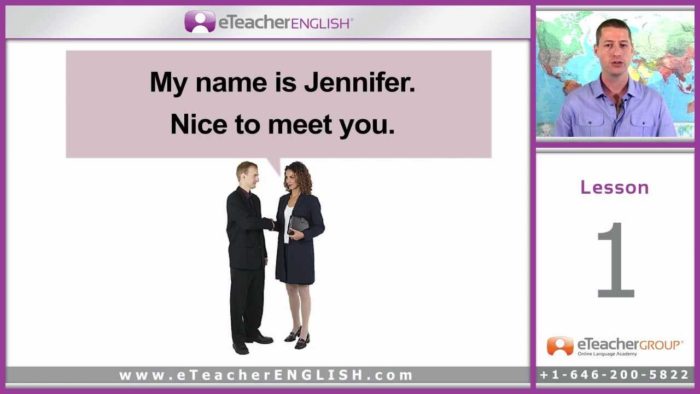 eTeacher English learning video lesson 1. Introductions: Saying hello, meeting new acquaintances, and getting to know other people. You actually may learn English out of your home along